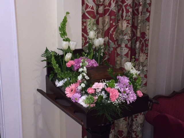 When Danny came in I complimented on the display. His urn ark had always been displayed but not with flowers. He told me he had a new onsite florist and she had decorated it for a service that afternoon.